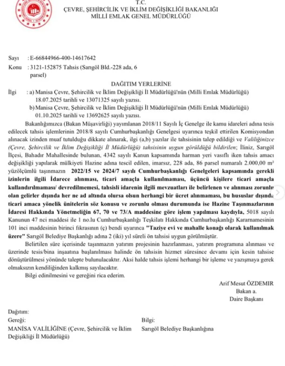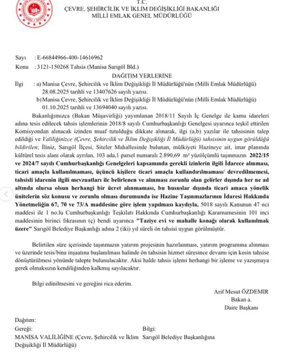 “İlgi yazılar ile Bahadırlar ve Siteler Mahallemize kazandıracağımız ‘Taziye Evi ve Mahalle Konağı’ projelerimizde, yer tahsisi konusunda bizlere destek olan başta Manisa AK Parti Milletvekilimiz Sayın Murat Baybatur’a, Sarıgöl AK Parti İlçe Başkanımız Sayın Nihat Demirci’ye ve emeği geçen herkese teşekkür ederim. Her şey Sarıgölümüz için.”