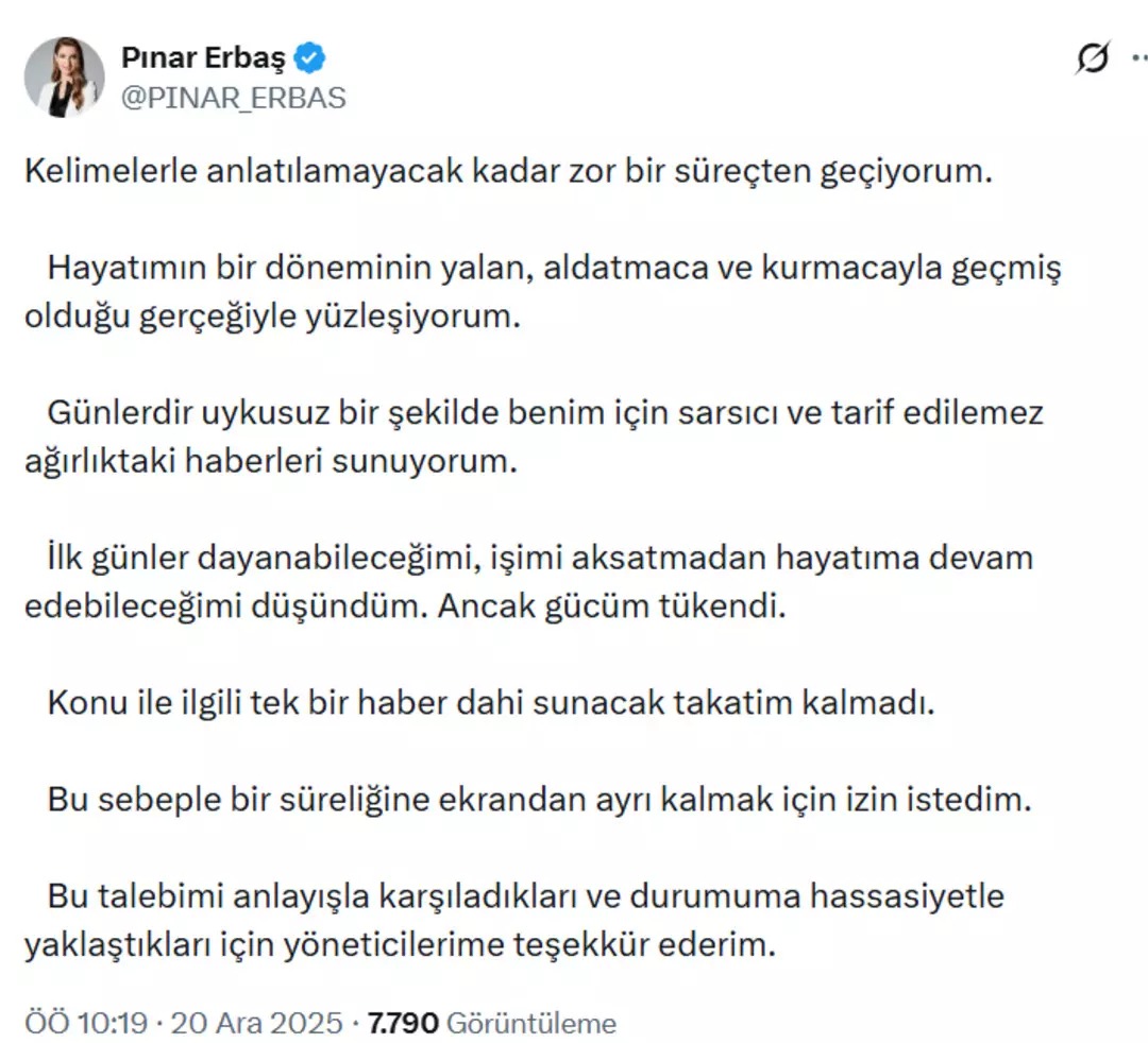 Erbaş, bu nedenle kanaldan izin talep ettiğini belirterek, “Bir süreliğine ekrandan ayrı kalmak için izin istedim. Yöneticilerim bu talebimi anlayışla karşıladı. Gösterdikleri hassasiyet için kendilerine teşekkür ediyorum” dedi.