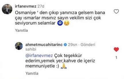 Yaklaşık bir ay önce İrfan Evmez, Arınç’ın Instagram’daki bir paylaşımına “Osmaniye’den çıkıp yanınıza gelsem bana çay ısmarlar mısınız sayın vekilim, sizi çok seviyorum”