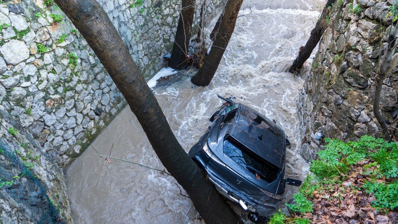Manisa’da dün akşam saatlerinde etkili olan fırtına ve sağanak yağmur hayatı olumsuz etkiledi. Şehzadeler ilçesindeki Çaybaşı Deresi’ne bir otomobil sürüklenerek düştü. Aracın son hali sabah saatlerinde görüntülendi.