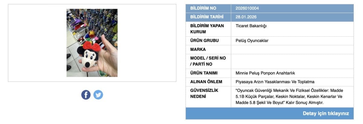 Bakanlık, Minnie Peluş Ponpon Anahtarlık ürününün boğulma riski sebebiyle tüketicileri uyardı