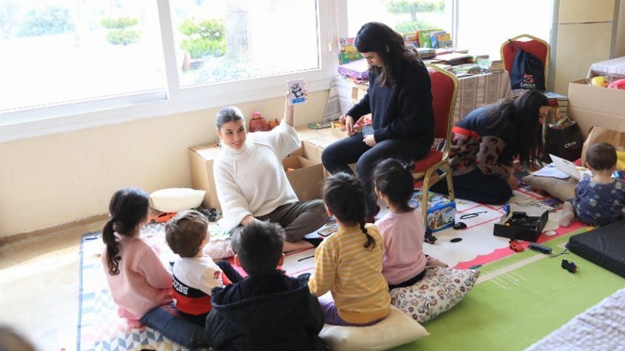 Kahramanmaraş merkezli 10 ili etkileyen depremler sonrasında İzmir’e gelen depremzede ailelerin Güzelbahçe Yardım Merkezine gelen ailelerin çocukları için çocuk oyun alanı oluşturuldu.İZMİR (İGFA)- Kahramanmaraş merkezli meydana gelen ve 10 ili etkileyen depremler sonrasında Güzelbahçe’de yakınlarının yanına yerleşen depremzede aileler yardım merkezine gelerek eksiklerini tamamlarken, çocuklarda oyun alanında zaman geçiriyor.