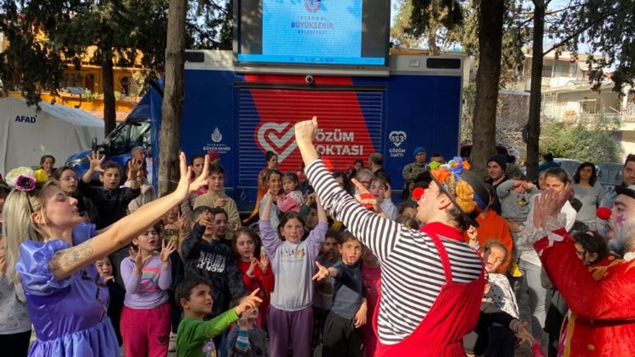 İzmit Belediyesi ile deprem bölgesine giden gönüllü tiyatrocular afetzede minikleri eğlendiriyor.HATAY (İGFA) - İzmit Belediyesi iş birliğiyle İzmit’ten deprem bölgesine giden gönüllü tiyatrocular, çeşitli oyunlar ve etkinliklerle depremzede çocukları eğlendiriyor
